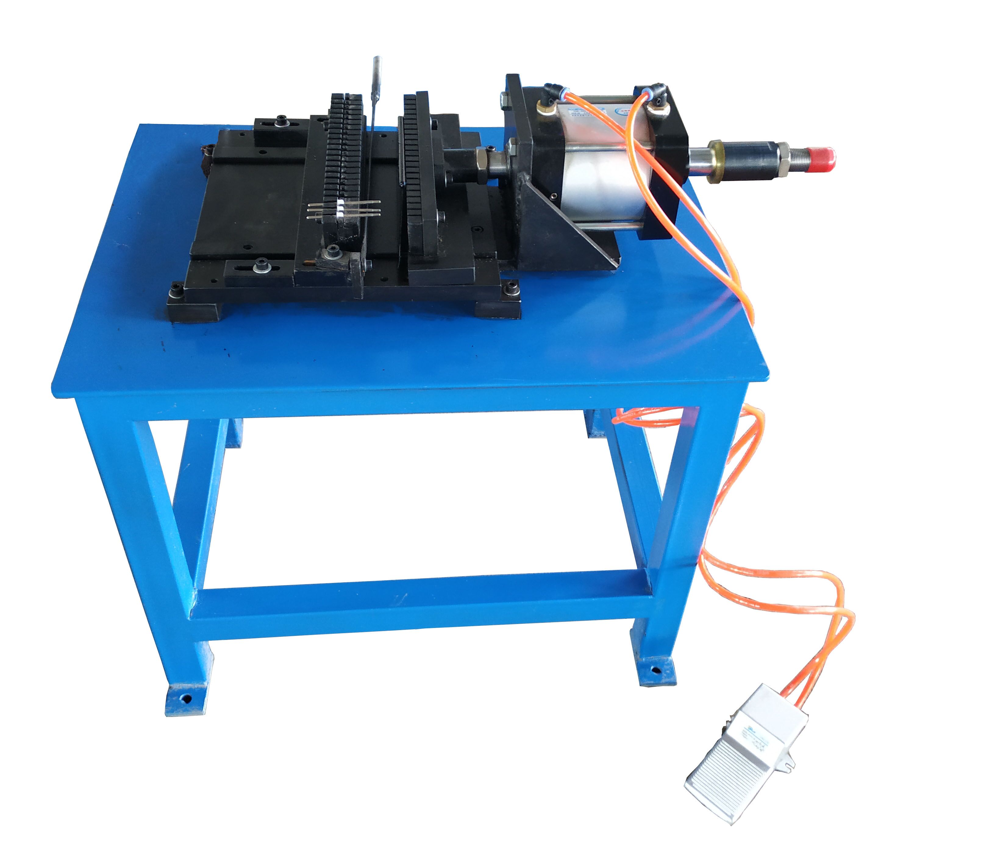 工作原理:工裝利用氣缸的動力,將引出棒和下端封口塞排列在定位槽內踩下腳踏閥(也可協商制成電控按鈕)12-24支引出棒便自動壓裝入下端封口塞。這種裝置勞動強度低,生產效率高。